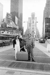 USA. New York state. New York City. JVC Jazz Festival. Time Square, at the corner of Broadway and 7th avenue. From left to right : Geneviève PEYREGNE (artistic agent) and French jazz musician Michel PORTAL (clarinets, saxophones, bandoneon) with his suitcase containing his sheet music and his stage costume, which was forgotten in a taxi earlier in the afternoon, Geneviève Peyrègne took the same taxi by chance and retrieved the suitcase. Before the evening concert at the Town Hall. The album "9-11 pm Town Hall" produced by Label Bleu will be recorded live during the concerts, and the music will be the soundtrack of the movie "Jazz Français à New York" filmed during the festival. Wednesday, June 29th 1988.