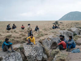 Turkey, Van. 2021. August 6. Migrants rest near rocks after fleeing to avoid being caught by the Turkish gendarmerie.
