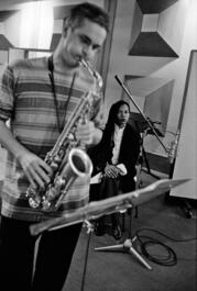 "FRANCE. Ile-de-France region. Paris. 6th arrondissement. Studio Acousti, 54 rue de Seine. RECORDING FOR THE DISC "Sarajevo Suite". From left to right: Austrian jazz musician Wolfgang PUSCHNIG (alto saxophone, flute) and American jazz singer Linda SHARROCK. Sunday September 18th, 1994.