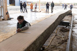 FRANCE. Créon. 16 December 2021. Parmi 1 000 chênes sélectionnés, le sciage des 8 grumes de taille exceptionnelle nécessaires à la restitution du tabouret de la flèche de Notre-Dame de Paris, a débuté aujourd’hui à la scierie des Géants, en Mayenne, dirigéé par Mickael Renaud.