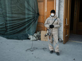KAZAKHSTAN. Almaty. January 2022. A police officer stationed in front of Almaty City Hall.