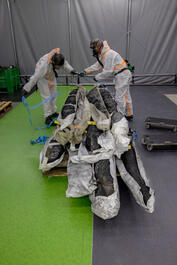 FRANCE. Saint-Witz. January 24, 2022. Storage place for debris (stones, calcined wood and iron) retrieved after the Notre-Dame fire. Research operations on calcined wood are carried out under the direction of Florence Mousset, study engineer responsible for movable archeological assets at the DRAC, and by Olivier Girarddos and Michel Lemoine of the CNRS.