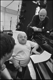FRANCE. Corse. Town of Calvi. CALVI JAZZ FESTIVAL. Commercial harbour, marquee. MICHEL PETRUCCIANI QUINTET (unexpected group composed the day before by Michel PETRUCCIANI with musicians participating to the Festival. Aldo ROMANO is special guest at the last minute). From left to right : the Belgian jazz musician Philip CATHERINE (guitar), the French jazz musician Michel PETRUCCIANI (piano), the French jazz musician Olivier KER OURIO (harmonica). Wednesday June 26th, 1996.