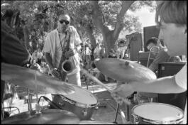 FRANCE. Corse. Town of Calvi. CALVI JAZZ FESTIVAL. Quai Landry, on the Golfe Taverne terrace SALVATORE LA ROCCA QUARTET The 5 PM Concert. From left to right : back, the Belgian jazz musician Salvatore LA ROCCA (double bass), the French jazz musician Lionel BELMONDO - guest (saxophone), the Belgian jazz musicians Phil ABRAHAM (trombone) and in the forefront, Dré PALLEMAERTS (drums). Tuesday June 25th, 1996.