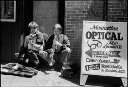 USA. New York state. New York City. Filming of the movie "Jazz français à New York" by Christian Palligiano during the JVC Jazz Festival. From left to right : French jazz musicians Didier LOCKWOOD (violin) and Michel PORTAL (clarinets, saxophones, bandoneon). Playing music in the street for the footage "Musiciens de rue" before the concert the next day at the Town Hall. Tuesday, June 28th 1988.