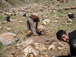 Turkey, Van. 2021. Mehmet Can 37 (R) and Masallah 37 (L) are shearing the sheep. It is a seasonal process that nomads repeat once they arrive in highland, before the hot wave arrives.