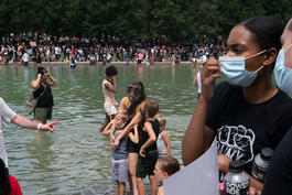 USA. Washington, D.C. 2020. Tens of thousands of peaceful protestors gather outside the Lincoln Memorial on the 57th anniversary of the March on Washington to call for social and racial justice. It was a sweltering hot day, and some protestors took to the Lincoln Memorial Reflecting Pool to cool off.