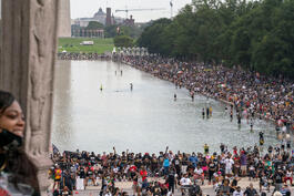 USA. Washington, D.C. 2020. Tens of thousands of peaceful protestors gather outside the Lincoln Memorial on the 57th anniversary of the March on Washington to call for social and racial justice. It was a sweltering hot day, and some protestors took to the Lincoln Memorial Reflecting Pool to cool off.