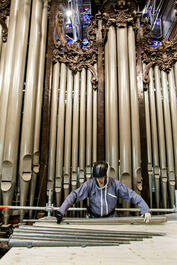 FRANCE. Paris, the 08th September 2020. Beginning of the disassembly of the organ of Notre-Dame of Paris' cathedral. Technicians and organ builders are removing the horizontal tubes (les chamades). The organ is composed of 8000 tubes.