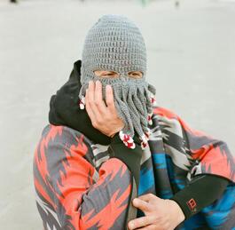 A participant with his octopus face mask to keep him warm and disinfected.