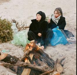 Winter swimmers coming together in front of the fire and trying to keep themselves warm after a cold water challenge.