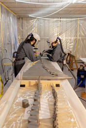 FRANCE. Corrèze. Liourdre. 22 April 2022. Restoration of around 6000 from the 8000 tubes of Notre-Dame's organ at Olivier Chevron's atelier, formerly the studio of famous organ builder Bertrand Cattiaux. Eva Delmas, Laurent Massalve and Gonzalo Frau working for M. Chevron.