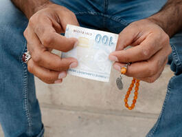 TURKEY. Hasankeyf. 2021. The construction of the Ilisu Dam, the global pandemic and the unprecedented economic crisis that Turkey is going through have put the people of Hasankeyf in a very difficult situation where their lives depend entirely on tourism. Here, a tourist guide is holding 100 Turkish Liras (the equivalent of a few dollars) in his hand, which he has just earned by selling a few catalogs to the very few visitors.