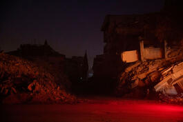 TURKEY. Antakya. 2023. Police lights at night in destroyed downtown Antakya.