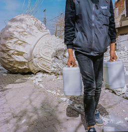 TURKEY. Hatay. February, 2023. In the aftermath of the 7.5 and 7.7 earthquakes that hit southern Turkey and nothern Syria. A boy passes a fallen minaret, carrying water to his tent. The government declared that tap water was unfit for human consumption and could have dangerous impact on health, with the spread of dangerous diseases such as cholera.
