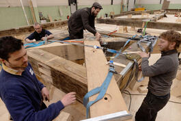 Carpenters are making, in workshop, an assembly test of the solid oak base, the part of the spire ensuring its anchorage in the pillars of the transept crossing.