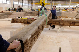 Carpenters are making, in workshop, an assembly test of the solid oak base, the part of the spire ensuring its anchorage in the pillars of the transept crossing.