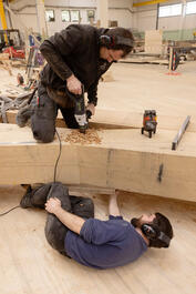 Carpenters are making, in workshop, an assembly test of the solid oak base, the part of the spire ensuring its anchorage in the pillars of the transept crossing.