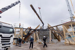 Carpenters are making, in workshop, an assembly test of the solid oak base, the part of the spire ensuring its anchorage in the pillars of the transept crossing.