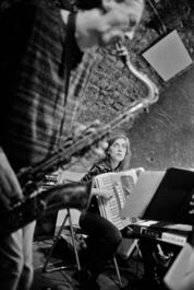 FRANCE. Bourgogne region. Nièvre department. Town of Nevers. Municipal theater, place des Reines de Pologne. "Rencontres Internationales de D'Jazz" Festival. From left to right, the US jazz musician Ellery ESKELIN (saxophone) and the US jazz musician Andrea PARKINS (accordion, piano, samplers). Rehearsal and soundcheck berfore the evening concert. ELLERY ESKELIN TRIO. Friday, 12th November, 1999.