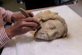 FRANCE. La COURNEUVE (93), the 30th of june 2022. Elements from the "jubé" of Notre-Dame found by INRAP archeologists at the crossing of the transept. They might be from the 13th century. Christophe Besnier was in charge of these excavations with Dorothée Chaoui-Derieux from the DRAC. Here, Camille Colonna, antropologist of INRAP is cleaning carefully a sculpture representing Jésus.