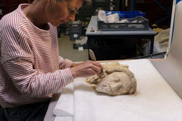 FRANCE. La COURNEUVE (93), the 30th of june 2022. Elements from the "jubé" of Notre-Dame found by INRAP archeologists at the crossing of the transept. They might be from the 13th century. Christophe Besnier was in charge of these excavations with Dorothée Chaoui-Derieux from the DRAC. Here, Camille Colonna, antropologist of INRAP is cleaning carefully a sculpture representing Jésus.