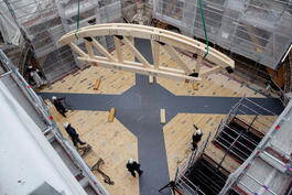 FRANCE. Paris, the 16th of november 2022. restoration and reconstruction of Notre-Dame'cathedral. A first wood framework is brought by a crane to rebuild the vaults destroyed by fire and the spire when it collapsed.