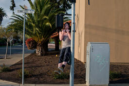 USA. Vallejo, California. 2016. 16 yr old Quinten does pull ups on the walk sign at Amador St & Tennessee