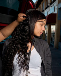 USA. Vallejo, California. 2016. Brittany in front of TNT Hair Studio on Sonoma Blvd, having a hair weave put in for vacation in Miami.