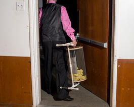 USA. Vallejo, California. 2016. Lottery tickets are taken away from the dance floor at the members only Moose Lodge. The members are mostly former workers at the Mare Island Naval Shipyard, which shut down in 1995, sending the city into bankruptcy and causing home owners to flee. The population became increasingly diverse after the bankruptcy, when people displaced from more expensive towns in the SF Bay migrated here.