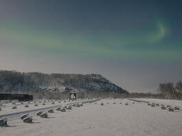 Northern lights above the Valley of Glory memorial where remains of Soldiers of World War II are buried.