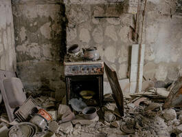 The destroyed kitchen of Alla Nikolaevna, 87. Most of her belongings were burned or stolen.