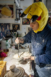 FRANCE. St. Ouen (Paris suburb). Artist Sarah Kalvar making plaster masks. 2023