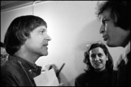FRANCE. Ile-de-France region. Seine-Saint-Denis department. Montreuil. 3rd edition of the "Banlieues Bleues" Festival. From left to right: French jazz musician Michel PORTAL (saxophones, clarinets, bandoneon), French artistic agent Genevieve PEYREGNE and German jazz musician Joachim KUHN (piano). In the backstage, between the soundcheck and the evening concert at 20:30. MICHEL PORTAL/JACK DEJOHNETTE. Friday 7th March, 1986.