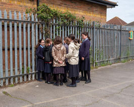 GB. ENGLAND. Canvey Island. 2023. Hasidic girls at school break...