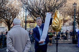 FRANCE. Paris, the 16th of december 2023. Reconstruction of Notre-Dame of Paris. Benediction by Paris' archbishop of the new coq of Notre-Dame drawn by architect in chief Philippe Villeneuve and lifting and posing of it at the top of the cathedral's new spire. Philippe Jost, president of EP of the reconstruction and restoration of Notre-Dame, showing the parchment which will be put inside the coq.
