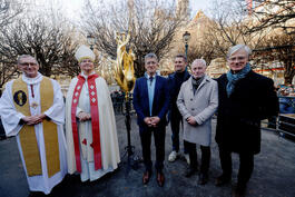 FRANCE. Paris, the 16th of december 2023. Reconstruction of Notre-Dame of Paris. Benediction by Paris' archbishop of the new coq of Notre-Dame drawn by architect in chief Philippe Villeneuve and lifting and posing of it at the top of the cathedral's new spire.