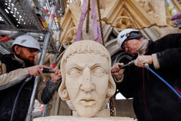 FRANCE. Paris, the 06th of march 2024. Notre-Dame'cathedral's restoration and reconstruction. Posing of a chimera at the south pinion.