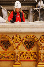 FRANCE. Paris, the 06th of march 2024. Notre-Dame'cathedral's restoration and reconstruction. restaurer Nathalie Pruha, cleaning the top of the altar server (Maitre d'autel) from Violet-Le-Duc's period.