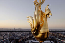 FRANCE. Paris, the 16th of december 2023. Reconstruction of Notre-Dame of Paris. Benediction by Paris' archbishop of the new coq of Notre-Dame drawn by architect in chief Philippe Villeneuve and lifting and posing of it at the top of the cathedral's new spire.