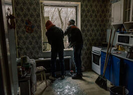 RUSSIA. Belgorod. 15 March 2024. Workers clear broken windows of the flat of Yana and Michail after shelling.