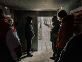 RUSSIA. Belgorod. 15 March 2024. People wait in a shelter during...