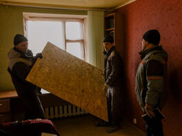 RUSSIA. Belgorod. 13 March 2024. Workers fix a window after a drone hit a housing complex.