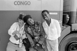 PEOPLE'S REPUBLIC OF CONGO. Brazzaville. "Decouvertes 85" annual song contest. From left to right, French photographer Guy LE QUERREC, Congolese singer ZAO and X. After the shooting of ZAO posing with a military uniform in reference to his song "Ancien combattant". Tuesday 29th October, 1985.