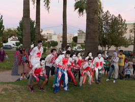 Young actresses and actors, working with the Fani Raghman Ani group, an association defending human rights in Tunisia, performing in a street theatre about the 2011 revolution and violence that followed. The play took place in a central Tunis park, where many families visiting the park were surprised and interested to see such a play. Those invited to be in the theatre are mostly from the poorer regions of Tunis and other cities.