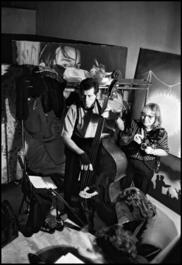 FRANCE. Ile-de-France region. Seine-Saint-Denis department. Le Blanc-Mesnil. Louis Daquin Cinema. 7th edition of the "Banlieues Bleues" Festival "4 semaines de jazz en 93". From left to right, French jazz musician Bruno CHEVILLON (double bass), Swiss-French photographer Sabine WEISS and, sitting, French jazz musician Armand ANGSTER (clarinets). In the backstage, after the soundcheck and before the evening concert at 20:30. LOUIS SCLAVIS "CLARINETTES". Friday 23rd March, 1990.