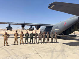 JORDAN. Zarqa. 02 August 2025. King Abdullah II Air Base, a Royal Jordanian Air Force base located near Zarqa. A French aircraft carrier, loaded with 8 humanitarian aid pallets for Gaza, waits for the IDF's green light to carry out the aid drop in a stopover base. French soldiers from the 1st Parachute Transport Regiment participating in the humanitarian aid drop over Gaza.
