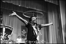PEOPLE'S REPUBLIC OF CONGO. Brazzaville. Palais des Congres. "Decouvertes 85" annual song contest organised RFI (Radio France Internationale) and more than 60 radio stations from Africa for Cultural and Technical Cooperation, the African recording industry, the African Cultural Institute, the French Minister for Foreign Affairs, the magazines Amina and Calao, the SACEM and TF1. Ngeleka KANDANDA (vocals, sanza). During the 2nd recital of the 1st part of the gala. Friday 25th October, 1985.