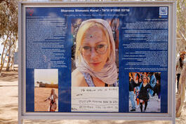 ISRAEL. Negev, Reim, the 1st of October 2025. On the site of the Nova music festival where 379 young people were killed and hundreds injured on October 7, 2023. Relatives and friends have mounted pictures of those killed and often come to pay tribute. Here, a tribute to Sharona Shmunis Harel who has been assassinated the 7th of October 2023. She was 40 and had two children with her husband Yotham: Rom, 11 years old and Alma, 8.