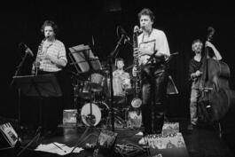 FRANCE. Ile-de-France region. Paris. 13th arrondissement. Théâtre Dunois, 28 rue Dunois. In the foreground, from left to right : French jazz musicians Maurice MERLE (saxophone) and Louis SCLAVIS (saxophones, clarinets). In the background, from left to right : French jazz musicians Christian ROLLET (drums) and Jean BOLCATO (double bass). Concert for their 20th anniversary and their anniversary CD. WORKSHOP DE LYON 1967-1987 "On n'a pas tous les jours 20 ans". Thursday, May 7th 1987.